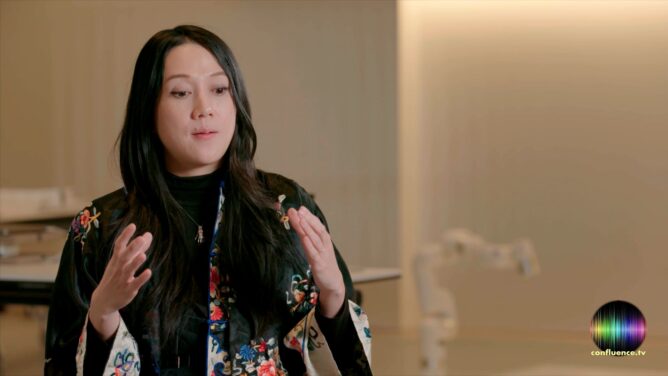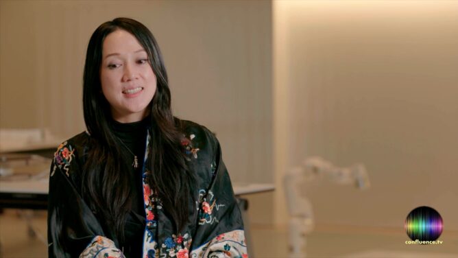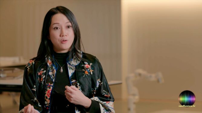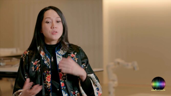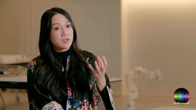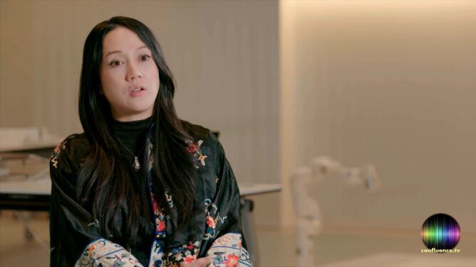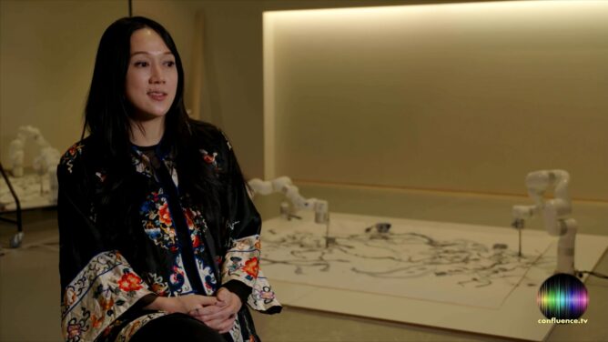 Sougwen Chung is a Canadian-born artist who works with drawing, sculpture, and performance. Her art explores the relationship between humans and machines, often using custom-built robotic arms as collaborators in her drawing process. She investigates themes of collaboration and the future of human-machine creativity.