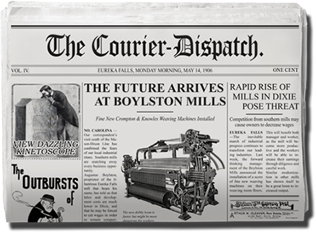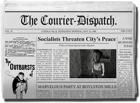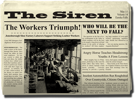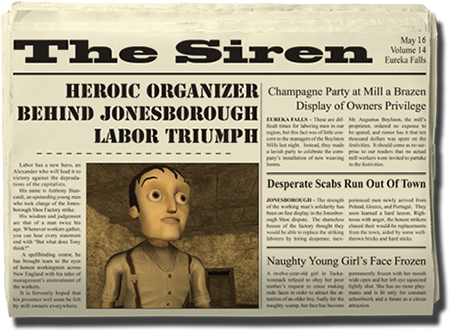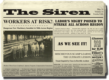 The town of Eureka Falls has two daily newspapers, each with a distinct point of view. Players should buy both papers daily in order to get a range of opinions on the issues in the game. The Courier-Dispatch is the businessman's paper, taking a strong anti-labor line at every opportunity. The Siren is extremely pro-labor and never misses an opportunity to take shots at the wealthy.